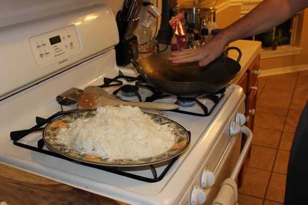 Yo uso una espátula de madera plana para ayudar a todo el proceso. Usted necesitará continuar 'plegado' el arroz y la carne en una vez que usted ponga en marcha. También me parece que la espátula de madera funciona bien para el proceso de tostado.