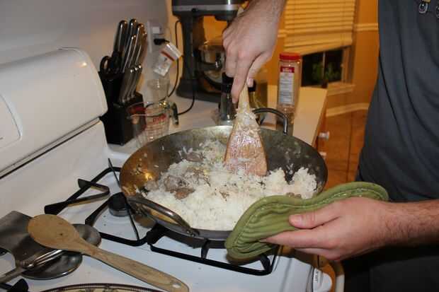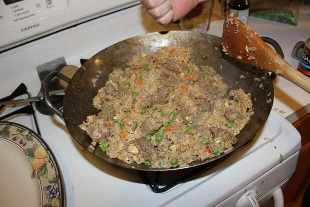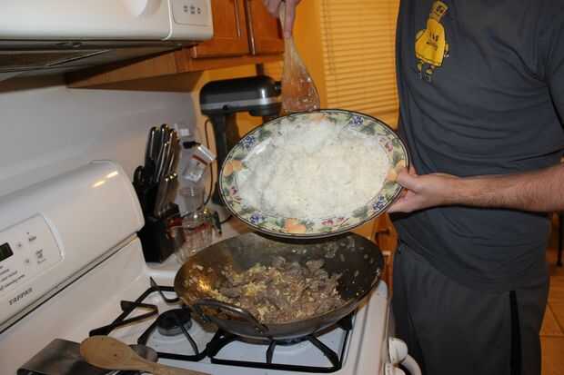 Una vez que la carne esté bien dorada y se cocinan huevos listo agregar el arroz.