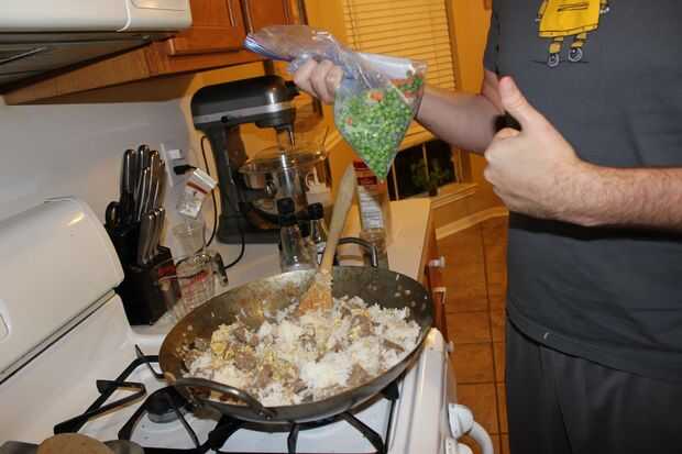 Una vez que el arroz está bien integrado en la mezcla, añadir su congeladas guisantes y zanahorias. Nota- Evitar la adición de tarde en la cocina. Al hacerlo te dejará con más difícilmente que la textura de la zanahoria deseable.