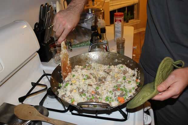 El arroz debe salir el refrigerador todavía frío antes de agregarla a la mezcla. Tirarla en! Aquí es donde empieza el trabajo. Para asegurarse de que el arroz está bien volver a cocinados, necesitará continuamente pliegan el arroz en sí mismo. Esto también se romperá cualquier grumos que el arroz ha hecho durante el proceso de secado.