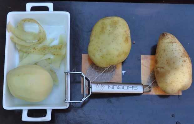 Os muestro un sencillo truco para quitar pieles de patata. En lugar de usar un pelador de usar un cuchillo para marcar la patata alrededor de su centro. Luego se coloca la patata en agua hirviendo hasta que esté cocido. La papa se coloca en un recipi
