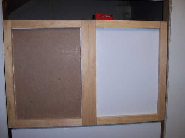la parte más difícil está hecha. pegar los marcos al frente de la puerta como se muestra. para llenar en el campo de la estructura y la cubierta la superficie de cuero optó por utilizar madera prensada - es barato, suave, estable, tiene pegamento de madera y lo más importante puede ser conseguido en una hoja muy fina para no hacer las molduras dentro el palo de Marcos hacia fuera orgulloso de la superficie del marco. Utilice una sierra de calar para cortar la madera prensada tamaño áspero - no tiene que ser perfecta ya que los bordes serán cubiertos. pegar el cartón con adhesivo de uretano y suavizar con un bloque de madera.