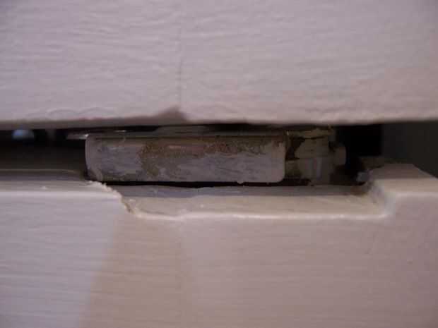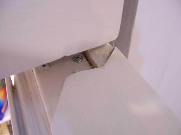 la puerta del fondo se realiza del mismo modo que la parte superior, excepto que aquí nos encontramos con la parte más delicada y menos elegante del proyecto. hay un reborde en la parte inferior de la bisagra de la puerta del congelador. Cuando se abre la puerta del congelador la brida hace pivotar hacia fuera, y subsidio debe hacerse para la moldura en la puerta de la nevera. la mejor manera de averiguar cómo hacer los cortes necesarios es simplemente sostener las piezas en lugar y observan la trayectoria de la brida como se abre la puerta del congelador. la madera puede cortarse con cincel, una herramienta giratoria, o a mano alzada en el inglete vio (tenga muy cuidado!).