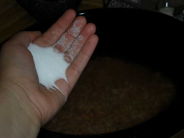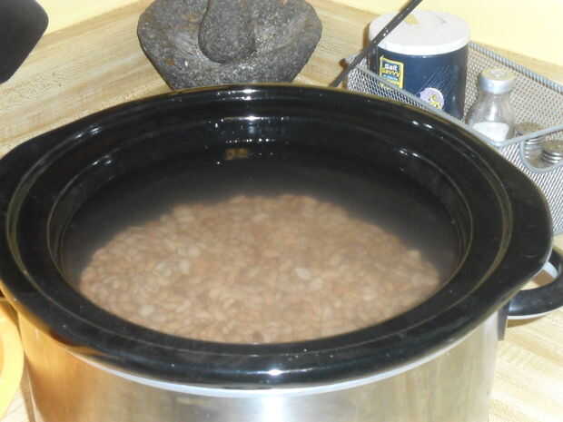 Añadir los frijoles a la olla.  Llenarla hasta arriba con agua.  Agregar dos puñados de sal.  Cubrir con la tapa y girar la olla hasta alta.