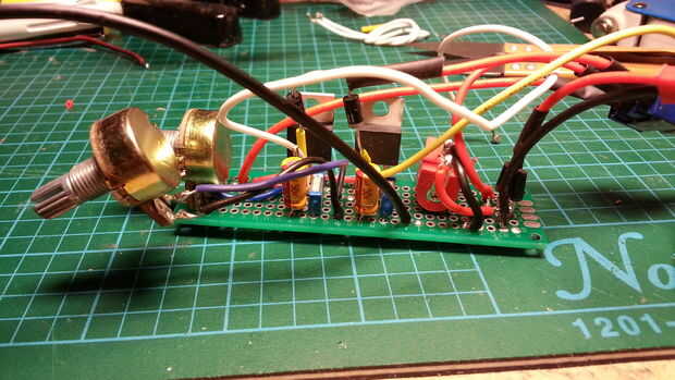La razón de esta elección es que el lm317 es un regulador de voltaje lineal (a diferencia de swithcing) que es una mejor opción para filmar y fotografiar. Con el regulador de voltaje lineal le dará una salida ligera constante en lugar de una luz parpadeante que podría levantarse piquete por cámara y resultado en los bares oscuros y brillantes a través de la imagen, como puede verse en la fotografía.