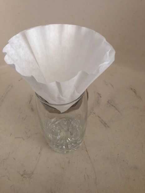 1) doblar el filtro hasta que se convierte en un cuarto del tamaño, abrir una hoja y coloque en su segundo vaso o recipiente.