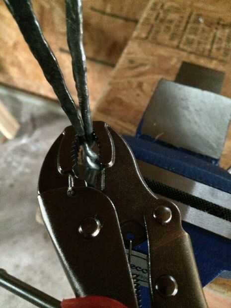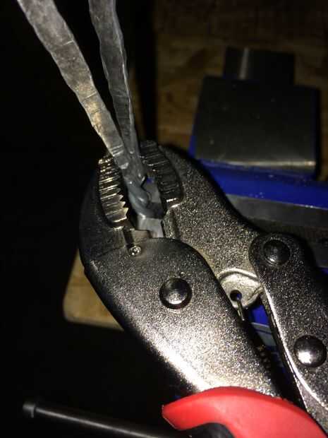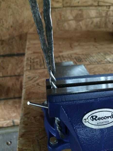 He visto bastantes videos de herreria en línea para ver cómo torció/desenroscado hierro para sus diversos productos obtener una idea de cómo proceder. Coloca las abrazaderas de tornillo en la parte butted hasta donde ronda cumple plana y conectado y fijado las asas de la prensa a ambas partes. No trate de desenroscar una puntas pieza a la vez. El desenroscar comenzará a ocurrir y quería uno de dientes a cada lado del plano donde está la manija torcida. Puede por ello sentido lo consulte a la segunda a la última imagen para ver lo que me refiero. Es uno de dientes plano, en exageración gruesa, en forma de L y el otro es como una imagen del espejo.