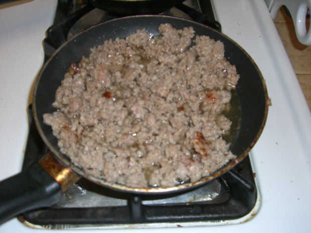 Salchicha crumble y freír en una sartén, drenaje y ponga a un lado.