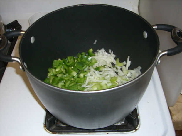 Saut las cebollas, el pimiento y el apio durante unos minutos hasta que la cebolla se ha vuelto casi transparente.