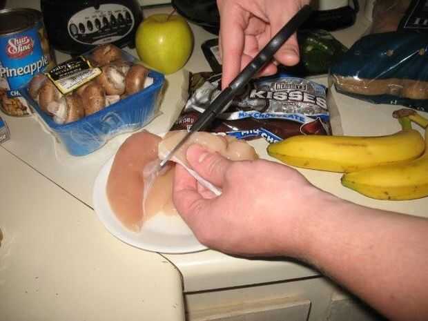 Pollo: Cortar el pollo en cubos de 1 "x 1" x 1/2" resultado productos finales similares a los Nuggets de pollo. En una nota lateral, siempre mantenga la carne cruda de verduras etc.. E. coli no es agradable!
