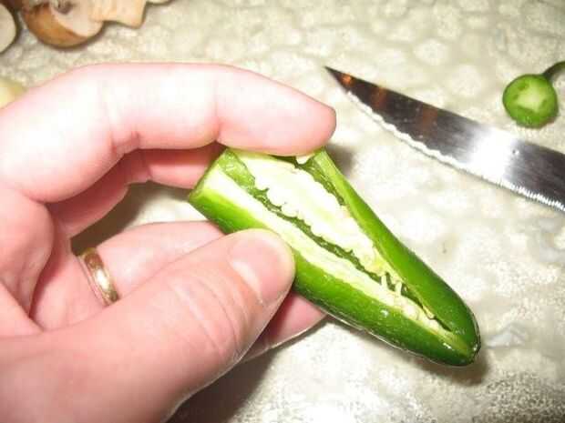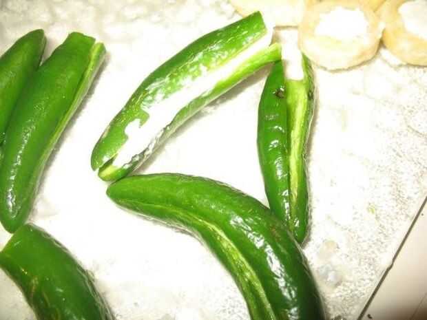 'Poppers' (pimientos picantes): eliminar el tallo, corte hacia abajo de un lado y retire el hollejo y las semillas. Las semillas son la parte picante. Poner un poco de queso crema en su interior y cierre nuevamente para arriba. Asegúrese de utilizar pimientos jalapeños o plátano. Por error compré pimientos de Cayena, y eran tan picantes que dejó quemaduras en los dedos (¡ ojalá estuviera bromeando!). Comida picante es grande, pero tenga cuidado de cómo picante es.