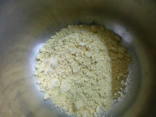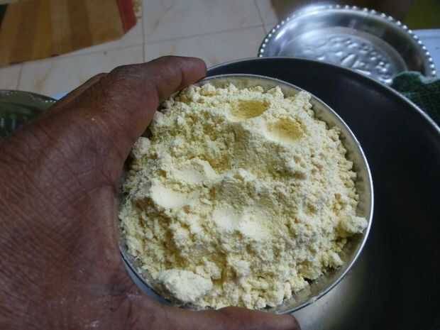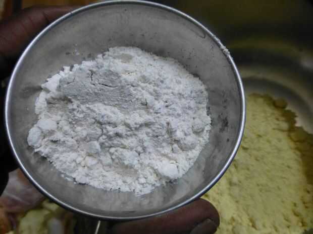 Tomar aproximadamente una taza de harina de garbanzo y alrededor de 1/4 taza de harina de arroz en un bol. Hecho con esta gran cantidad de harina la masa será suficiente para los florones de una cabeza de coliflor.