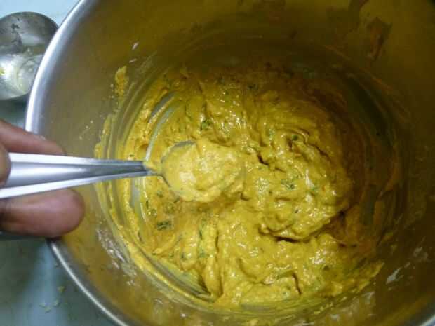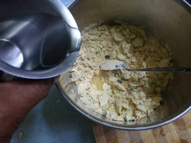 Para hacer la mezcla, agregue agua en pequeñas cantidades a la harina y mezclar bien. La mezcla no debe ser muy espeso o acuoso. La masa en la segunda foto es muy gruesa. Después de agregar algo más de agua, tenemos la masa con la consistencia correcta como se muestra en la última foto.