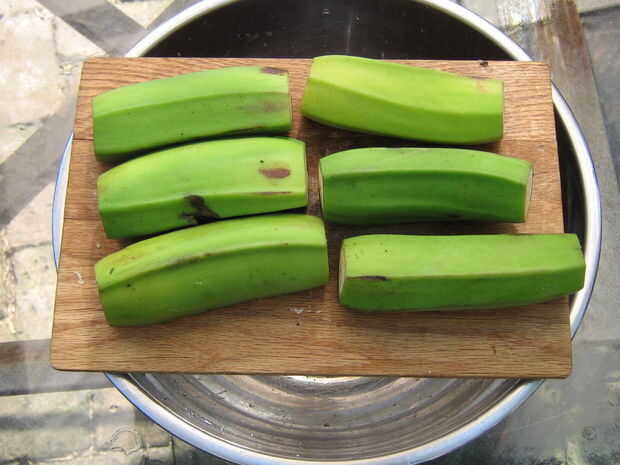 Quitar las cáscaras con un cuchillo - no pelar plátanos verdes como maduros.