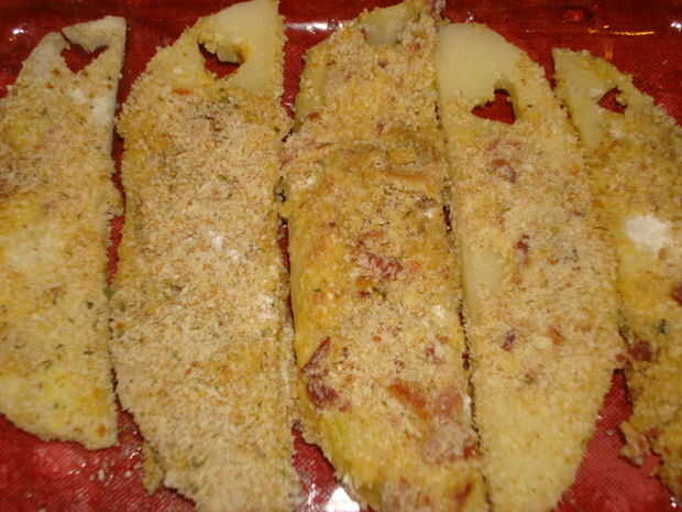 Coloque las patatas en una bandeja con un poco de aceite y hornear en el horno a 350 durante 30-45 minutos. Puede Agregar el tocino y parmesano queso unos minutos antes de servir u omiten en conjunto.