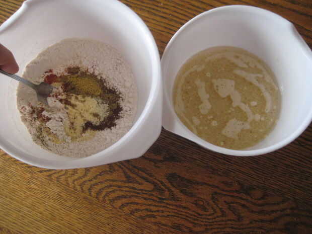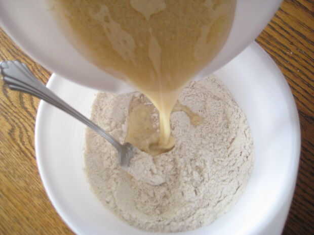 3 Vierta la mezcla húmeda en Bol de ingredientes secos y revuelva hasta que quede bien mezclado. Debe ser sólo un poco mocosa