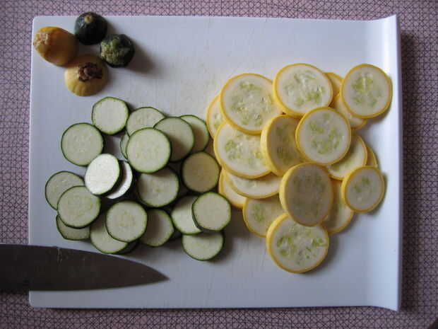 esta es una ensalada de verdura muy ligera y sabrosa.Es ideal para picnics y una manera perfecta de usar exceso de su jardín de calabazas de verano!Ingredientes~ 2 tazas de calabacín en cubos (cubos de ~ 1cm)~ 2 tazas en cubos calabaza amarilla (cubo