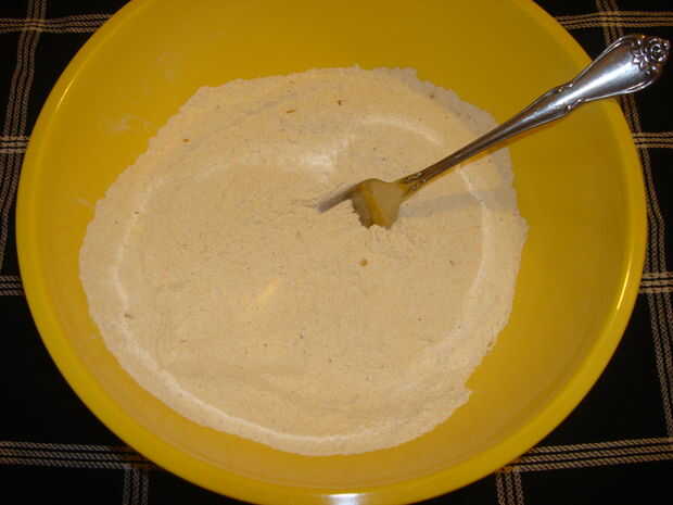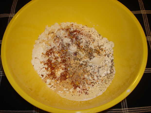 • En un tazón grande, combine la harina de maíz, harina, ajo en polvo y pimienta.