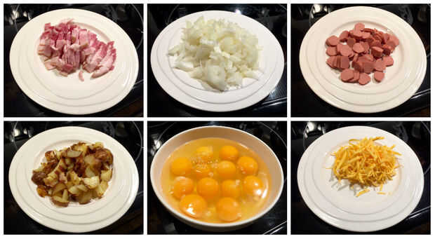 Para cada frittata desayuno, necesita los siguientes ingredientes. Y una grande de acero inoxidable cacerola de fritada.