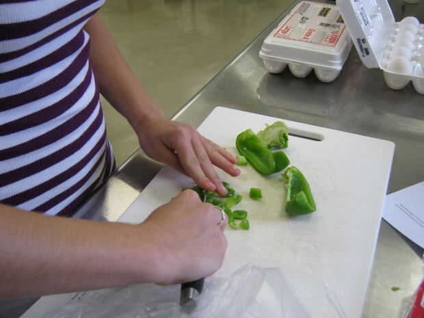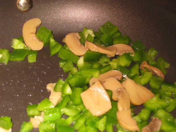 Primero debe picar la mitad de un pimiento verde en trozos pequeños. Después de picar el pimiento, tienen una sartén en la estufa a fuego medio con 1 cucharada de aceite. Luego añadir el pimiento verde y champiñones enlatados y drenar el líquido de la lata.