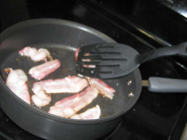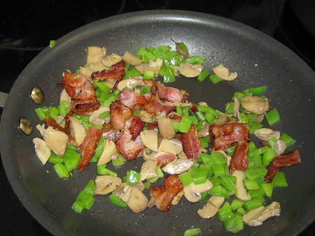 En este paso uno debe corte baccon en trozos pequeños, luego cocinar a través de todo el camino. Una vez que la cantidad de baccon en la frittata que desea, añadir el baccon a las setas y los pimientos.