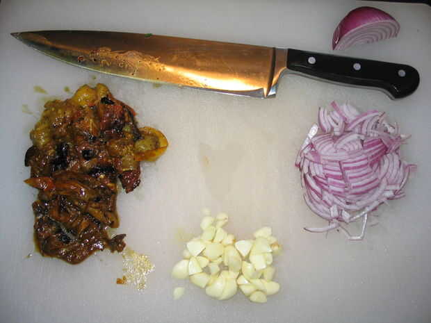 Configurar la bandeja vacía en la estufa, encendida tan bajo como va y dejarlo solo por un minuto mientras te pique el tomate, la albahaca y el ajo. Hará un par de whacks; Esto no es el French Laundry o algo casi tan fancy o complicados. Que alimento fresco, rústico y dar los bits whacks de machete como pocos con su cuchillo de grande. Si temes por tus dedos en su estado de privación de sueño, preparar los ingredientes la noche antes o a comienzos de la semana y aléjese de los cuchillos hasta que has tenido tu ducha/café, etc..