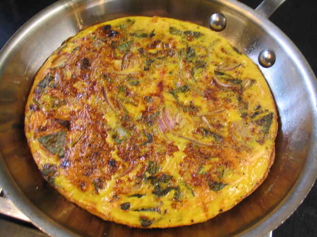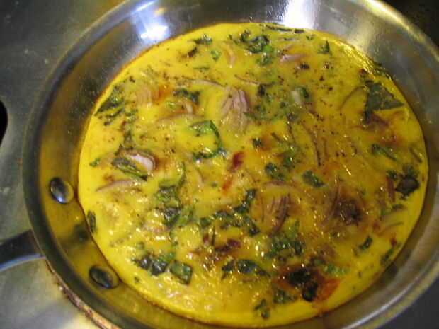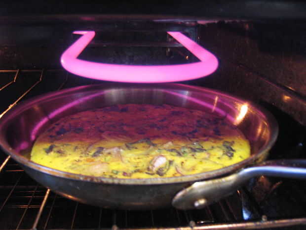 Palillo de la bandeja directamente debajo de la parrilla. Mantener un ojo en él, porque esto va rápido y fácilmente puede terminar con frittata ennegrecido.