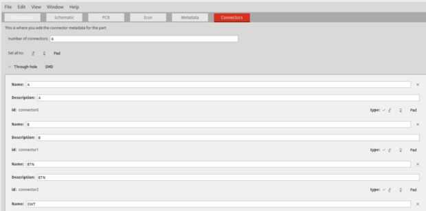 En los conectores de ficha puede cambiar el número de pines (esto no cambia el número de pines en los gráficos), defina los pernos para el mismo tipo, selecciona entre por el agujero y SMD y cambio el nombre, Descripción y tipo de pernos individuales.