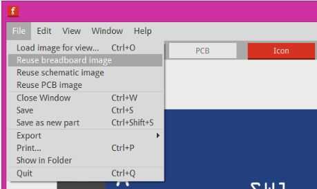 Lo último que tienes que cambiar es el icono. Más a menudo el icono de piezas de Fritzing es la misma imagen como la imagen de la placa. Cuando se abre el menú archivo puede seleccionar imagen de protoboard de reutilización.