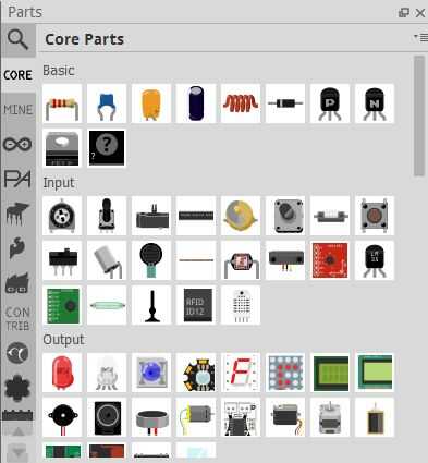El primer paso para crear una imagen de Fritzing es encontrar las piezas que desea utilizar. Fritzing viene con contenedor de piezas fundamentales, un cubo de "mis partes" y muchos otros contenedores de piezas de fabricantes específicos.