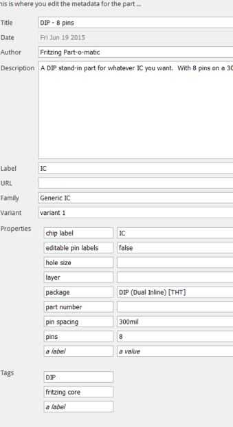 Una vez creado el archivo svg puede arrastrar cualquier parte como un chip de IC y el clic en el "esta opción de la parte editar". Se abrirá una ventana y encima puede cargar todas las imágenes en las lengüetas de la perspectiva. Usted desea editar la parte de datos Meta así puede añadir tu propia descripción a la parte. También puede cambiar el número de pernos en la Junta y cambiar el nombre de los pines como mejor parezca.
