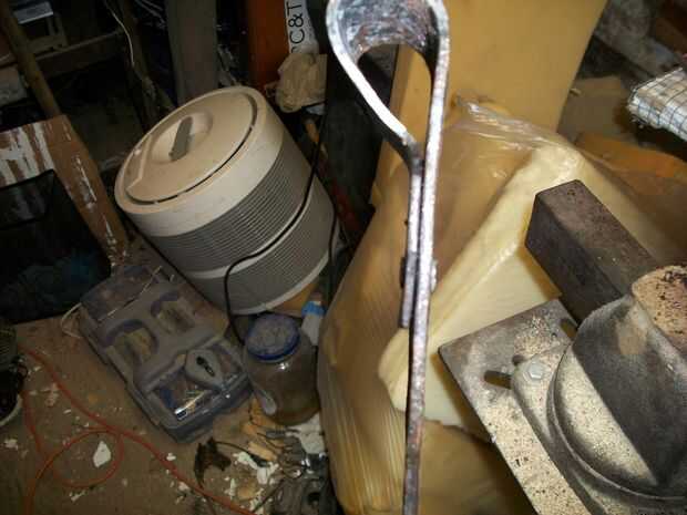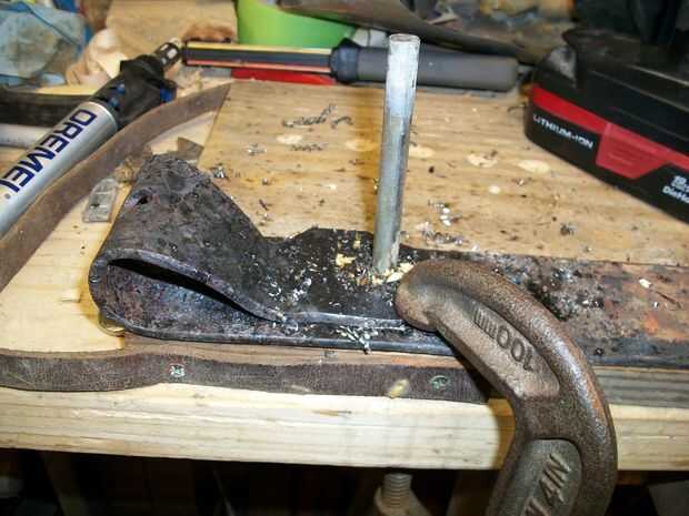 De todos modos, utilicé varilla de 3/8" acero para hacer mi remaches, y para ello utilicé una 3/8 broca. ¡ Pero! Yo había apagado el hendedor y el metal es duro, tomé mi soplete fiel y calienta la zona donde iba a perforar a un color cereza claro, comprobando por apagar las luces. Mientras esperaba a que la cuchilla se enfríe, tomé la barra de acero, la única parte realmente pagados y calentado sobre y de la pulgada y una mitad a una rojo cereza. Sospecho que era frío rodado, y por el recocido lo que estoy haciendo menos probable que se agriete y más fácil de cortar.