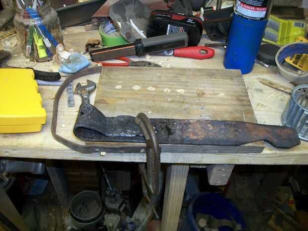 Cuando terminé cortando los remaches, podría manejar la cuchilla sujeta a una tabla de perforación sacrificio y taladrar dos agujeros, asegurándose de mantener engrasado para tirar el calor para que no arruine mi broca. con el primer agujero perforado utilicé un trozo de varilla para asegurarse de que ajusta y luego perforar el segundo orificio.