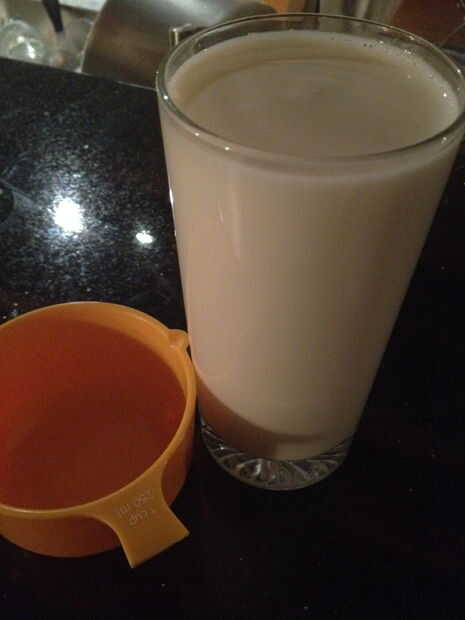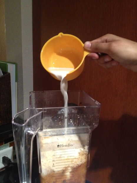 Por fin ha llegado el momento de verter la leche! Tomar dos tazas de leche y verter en la licuadora. Asegúrese de verter con cuidado, para que la leche no se derrame.  También no poner demasiada leche porque podría diluir el café y hacer el Frofee más débil. Tenga en cuenta que puede utilizarse cualquier % de grasa de la leche.