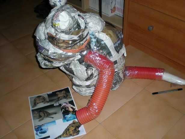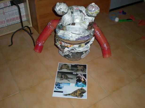 2 º hacemos una cabeza con papeles de periódico, una boca de cartón bien grande y la parte esférica de las botellas para los ojos. Y luego recubrimos con periódico.