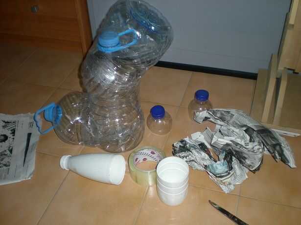 Lo primero que necesitamos es dos botellas cilíndricas de drenaje de agua, electricidad o tubo de trabajan, papeles de periódico, dos botellas con la bola superior o similar, una botella de leche o ser cónico, cola de carpintero y cinta de embalaje. Para completar varios cuadros en contacto con pegamento y una pinza de pelo grande.