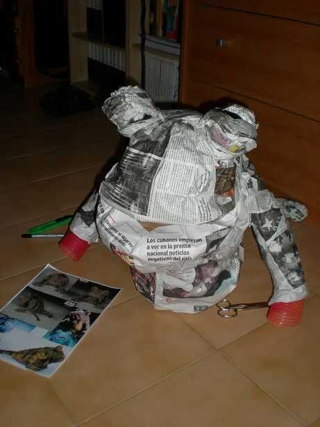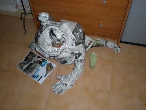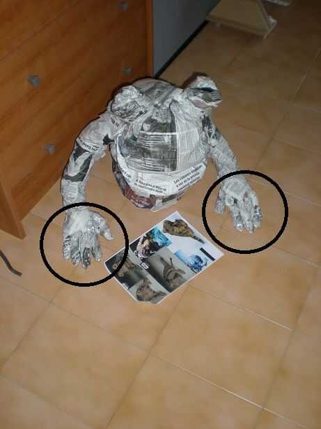 3 º lo recubrimos todo bien con periódico y cinta de embalar y hacemos dos manos de cartón y periódico usando nuestras propias manos como modelo en un cartón, luego algo de papel y cinta y listo. 3 º cubrir todo pero con periódico y cinta embalaje y hacer dos manos de cartón y periódico con nuestras propias manos como modelo en una caja de cartón, luego papel y cinta y listo.