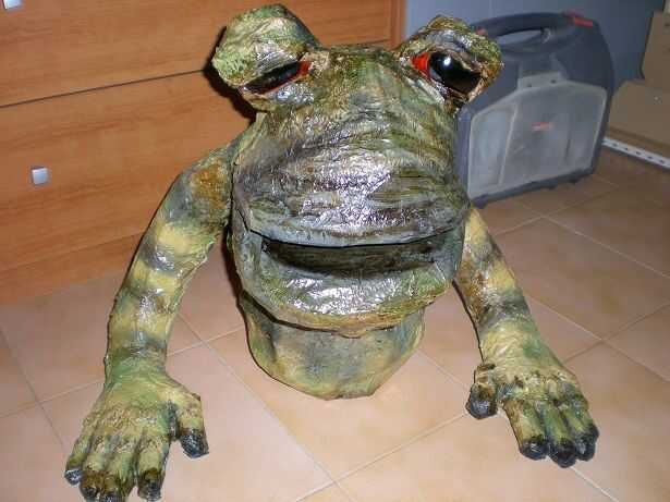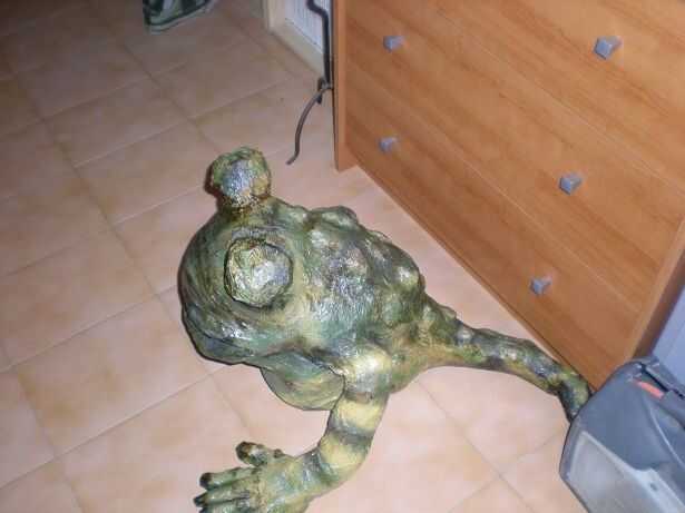 6 º luego pintamos con espray de colores verdes al gusto y los ojos en rojo y negro. Yo los pintado por dentro del plástico de la botella esférica de manera quede el brillo del plástico. 6 º luego pintado con spray de colores verdes rojo y negro los ojos y el gusto. He pintado los en el interior del plástico de la botella de modo que es el brillo de la bola de plástico.