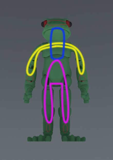 Ojos, manos y pies se encadenan con una la cuerda elástica que me permitió utilizar piezas más pequeñas y para aquellas piezas que algunos independientes del cuerpo principal. He incluido dos diagramas encordados que se deben utilizar como guías. Las líneas más gruesas indican que se debe utilizar el cable de 3mm. Las delgadas líneas rojas indican que se debe utilizar la cadena elástica.