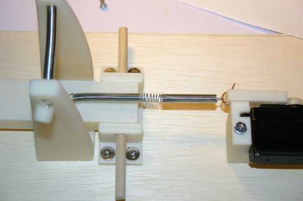 Instale la palanca catapulta usando 3" largo por espiga madera de 1/4" de diámetro.  Fije un 1/4 "x 3 1/4" primavera.025 a la palanca de la catapulta y el extensor de servo usando alambre del imán (#22).