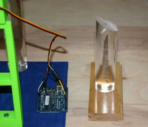 Tomar una barra de acrílico de 5 pulgadas (diámetro de 1 1/2 pulgadas) de largo y vio un extremo en un ángulo que es similar al ángulo del canal de aluminio cuando el canal aproxima el tren. Garantizar este acrílico en un bloque de madera (perforé un ajuste de agujero y fricción de 1 1/2 pulgada).