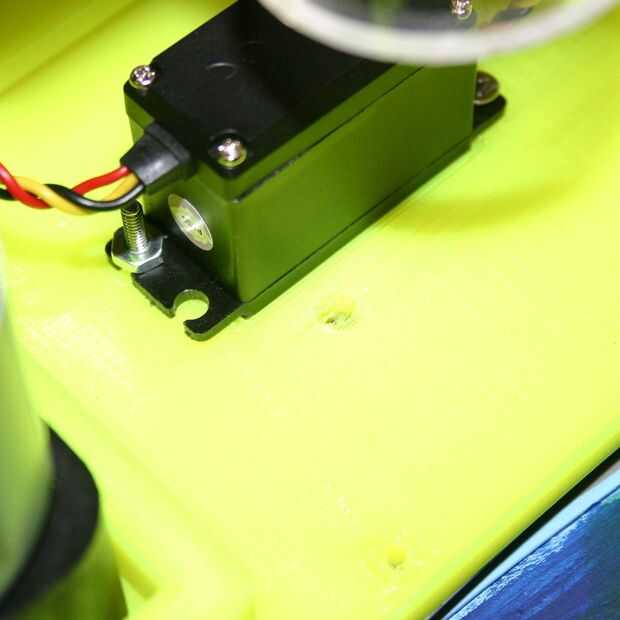 Tornillo del cuerno del servo a la madera contrachapada "tierra."  Mirando a través de los orificios de la placa base de plástico, ajuste el motor del servo en el cuerno del servo.