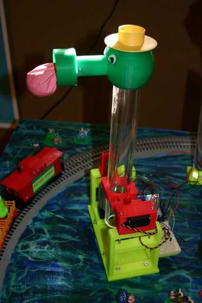 Se trata de las "ranas de vuelo," un paseo menor en el parque de atracciones de Froggy mundo aventurero ranas de plástico.Esto comenzó como un sketch, y luego la torre y el sostenedor de barra transversal fueron diseñados y 3d impreso:http://www