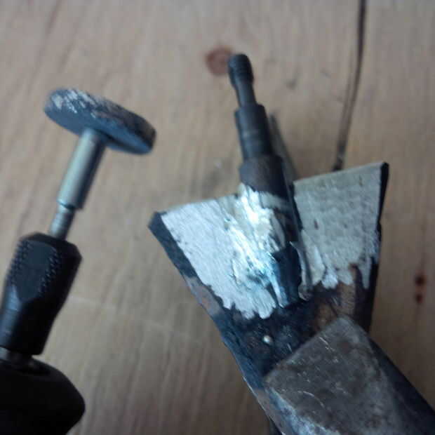 Con un dremal, una punta de corte y una punta de pulido, deshacerse de la soldadura extra.