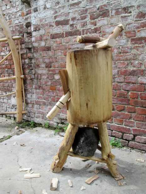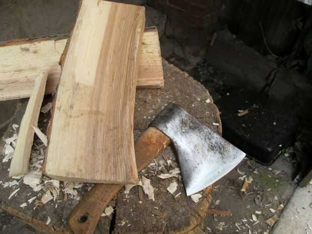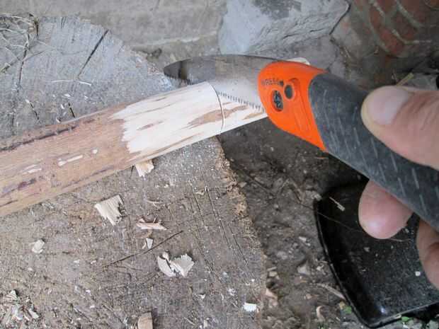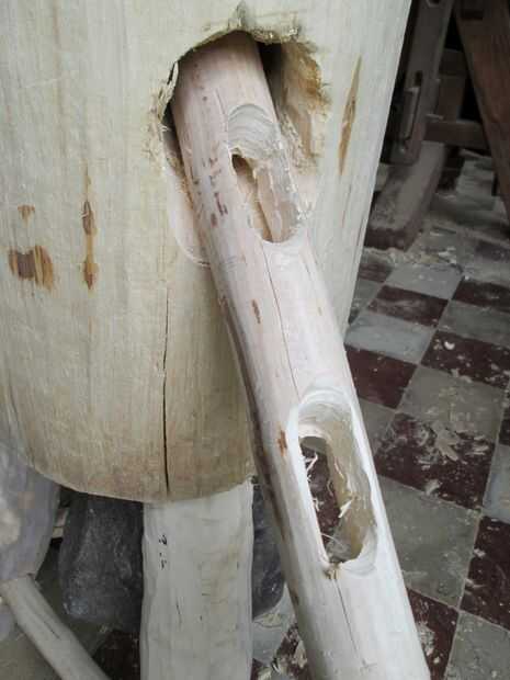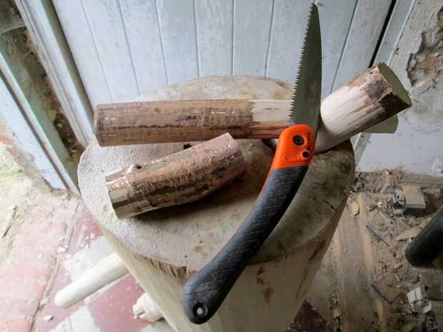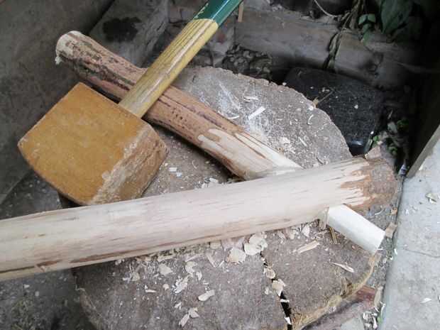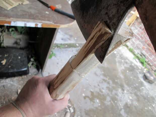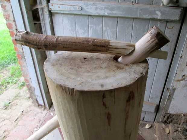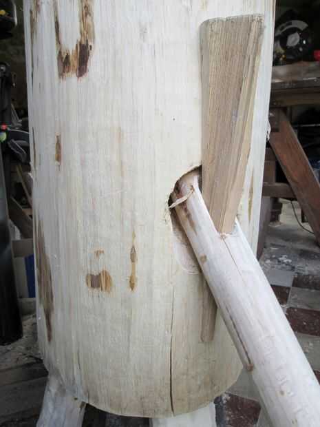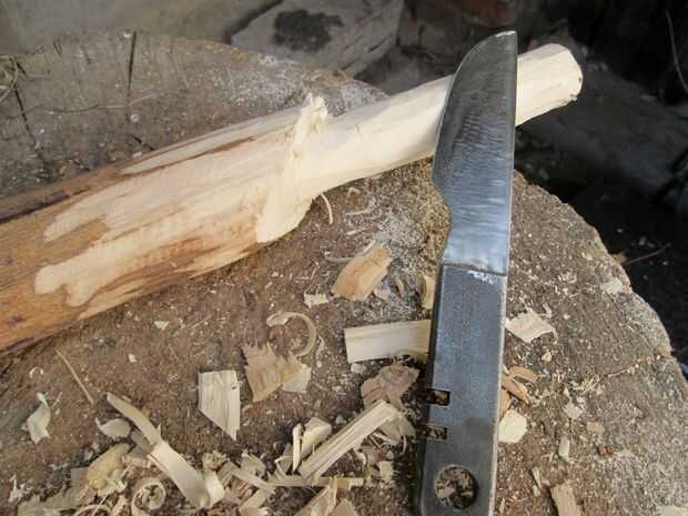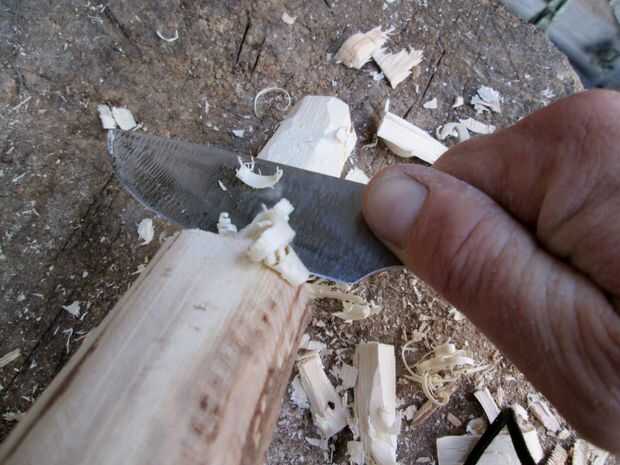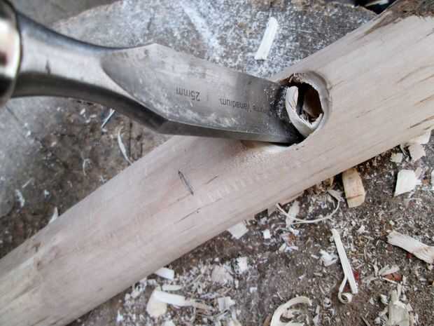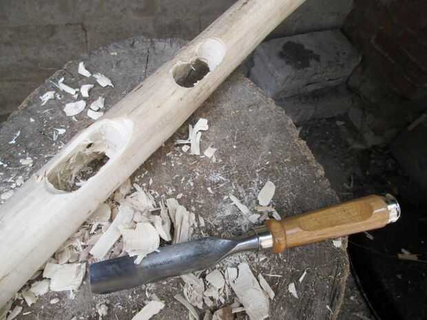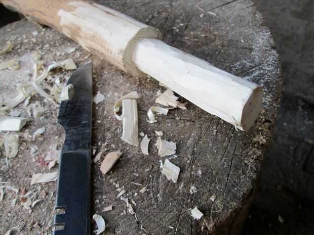 Empezar haciendo un 'dedo' en hazel. Circumsise una pieza de registro y uso hacha y cuchillo para reducir el diámetro en un extremo. A continuación, cincel un agujero de 45° en el extremo más grueso de la vara de avellano grande e introducir ese dedo.
