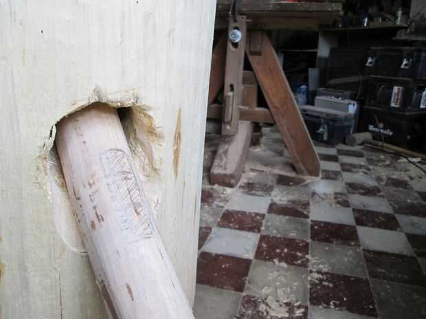 Inserte el 'culumet style' hecho en el registro y marca donde sale. Allí es donde harás el siguiente largo, el agujero. De largo, ya que necesitarás espacio para insertar una cuña grande.