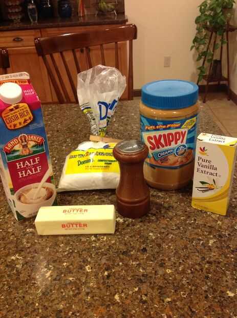 1) 1/2 taza de mantequilla de maní 2) 1 barra de mantequilla o margarina 3) 3/4 taza de azúcar de confitería 4) pizca de sal 5) 1/2 cucharada de extracto de vainilla 6) 1 cucharada de la mitad y half(heavy cream)