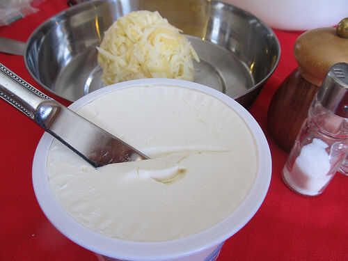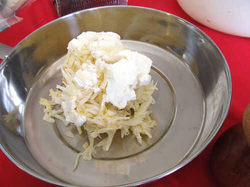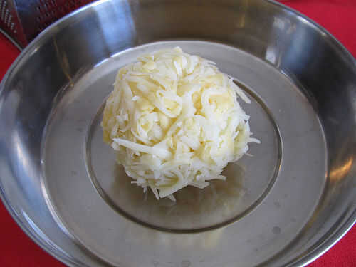 1. Ralla la mozzarella y el havarti, les mezclada y luego uno en bolas. Utilicé queso rallado porque pensé que se derrita mejor. Pero havarti y mozzarella rallado no como mojada de la nieve. Así que usted puede intentar tallar un bloque de queso en círculos y los círculos de apilamiento en bolas.