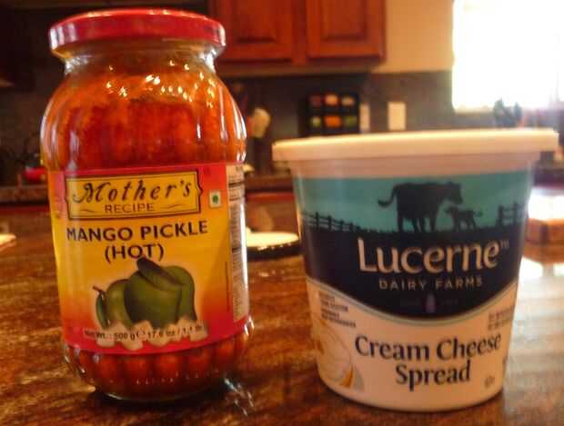 Pickle. Me gusta usar el queso crema para untar de estilo suave. En cuanto a la salmuera del mango, intento comprar de la marca de la madre como ha sido recomendado a mí por indios amigos. Realmente vivo en una zona de techie así en mis paseos por la mañana, de vez en cuando me encuentro con una pareja mayor de India. Llegamos a hablar de la India y le pido si puede recomendar un mercado indio local a comprar algunos encurtidos de Mango. Bien palabra de la madre universal de nueve carta amor es "eateateat", por lo que no pasará mucho tiempo antes de que ella me lleva a su casa y me da un frasco de encurtidos caseros. Devolver el favor por traer de vuelta un adorno hindú de Ganesha.