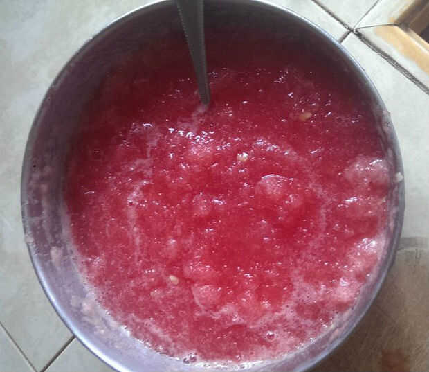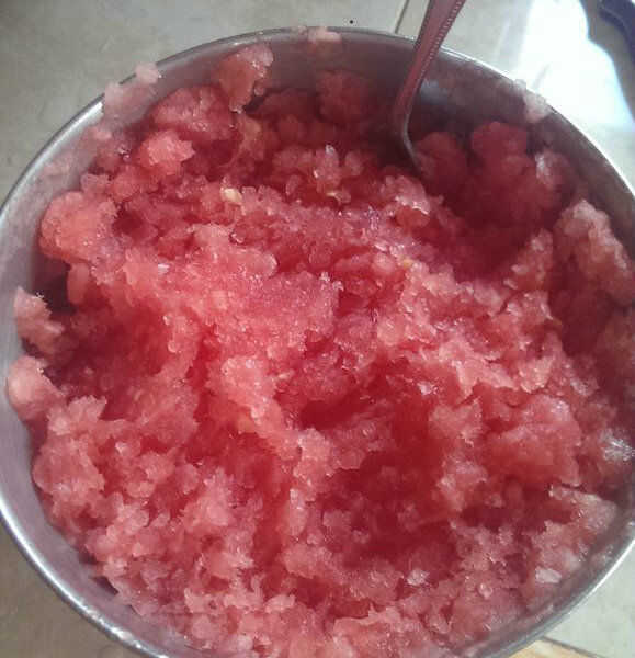Cada hora más o menos tomar la sandía del congelador y romper cualquier pedacitos congelados. Después de cinco o seis horas debe tener la consistencia de un cono de nieve en que punto puede servir.